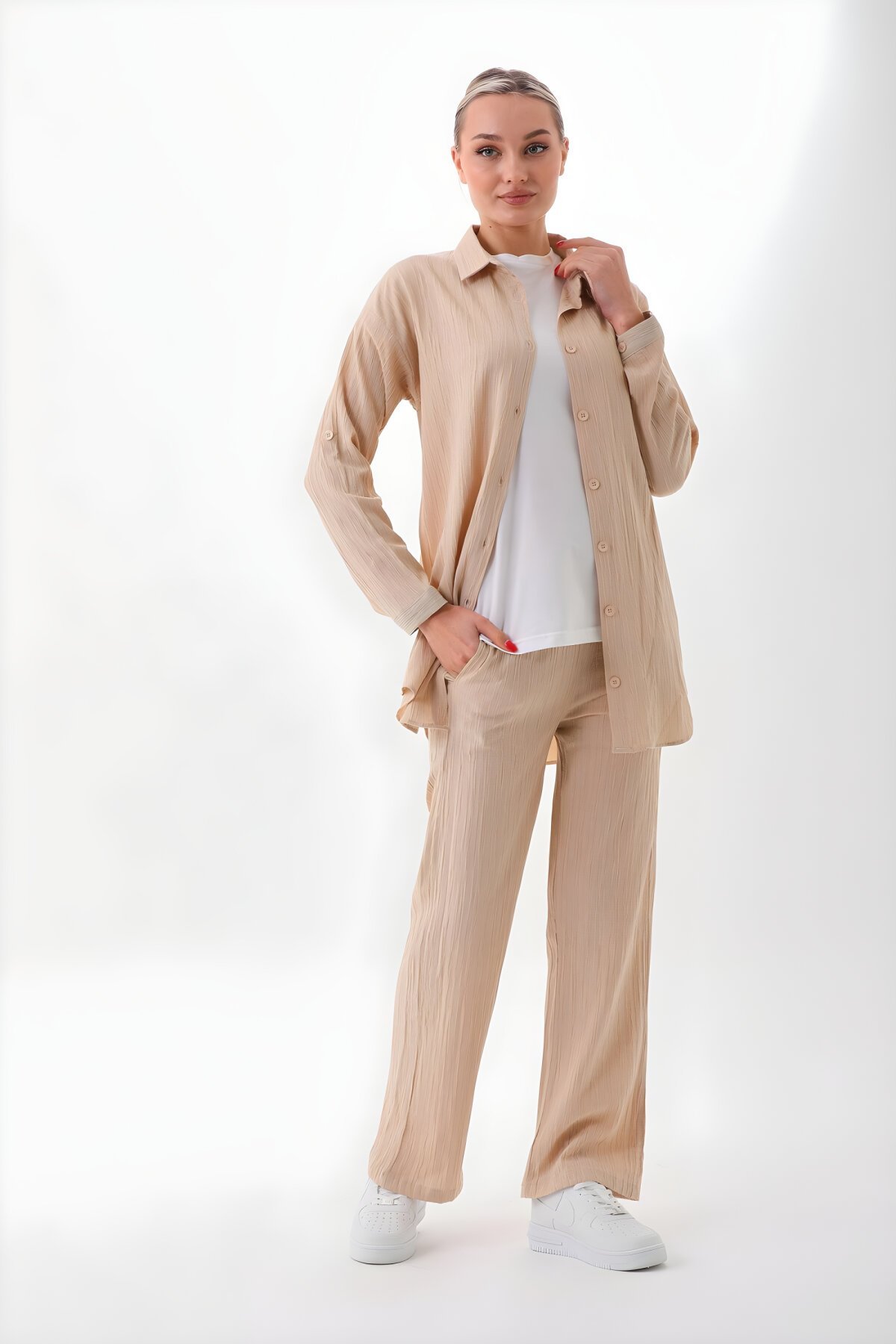 Kadın Günlük Üçlü Takım Gömlek Pantolon T-Shirt - BEJ - 662