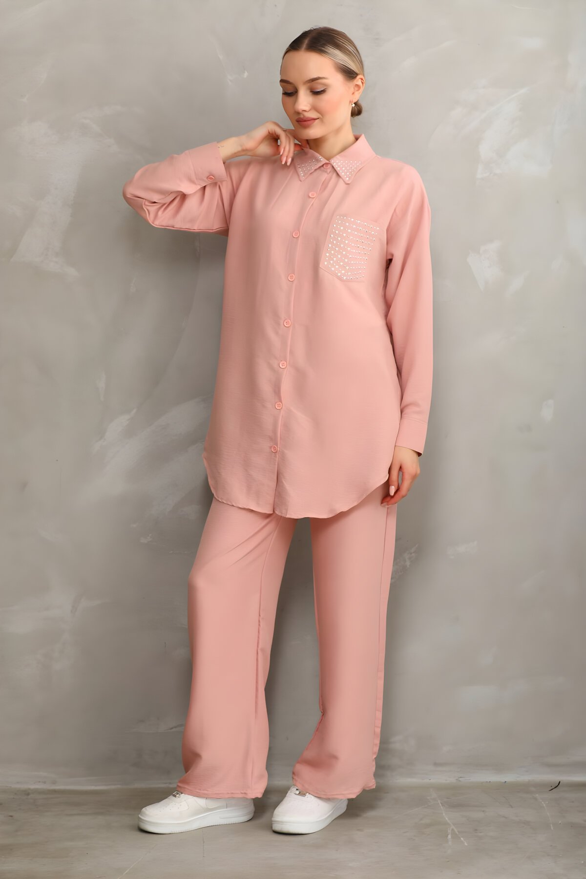 WestboundTaş Detaylı Pudra Rengi Yazlık Tunik Pantolon Takım