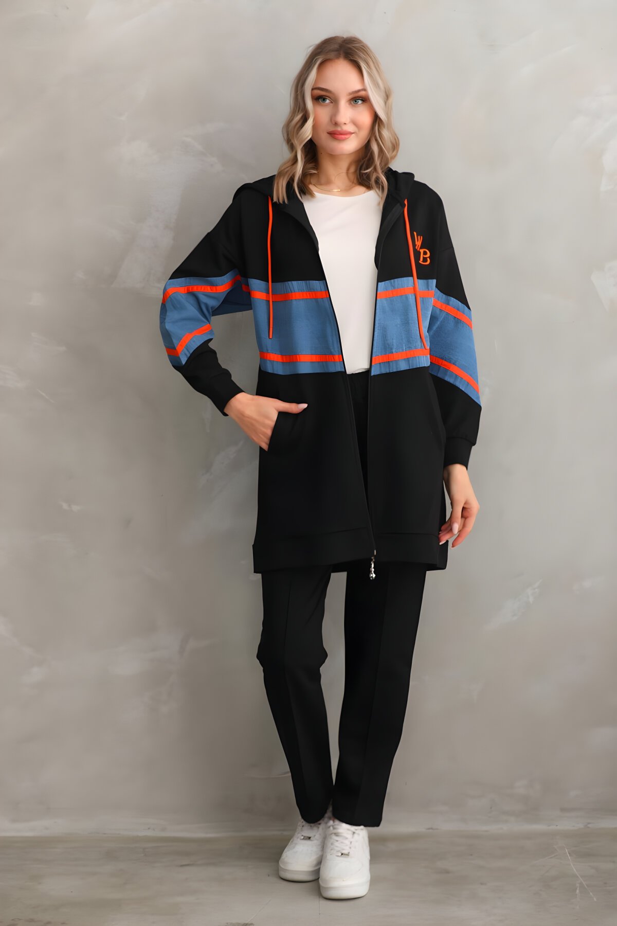 Kadın Kot Parçalı Şeritli Alt Üst İkili Eşofman Takımı SİYAH- 674