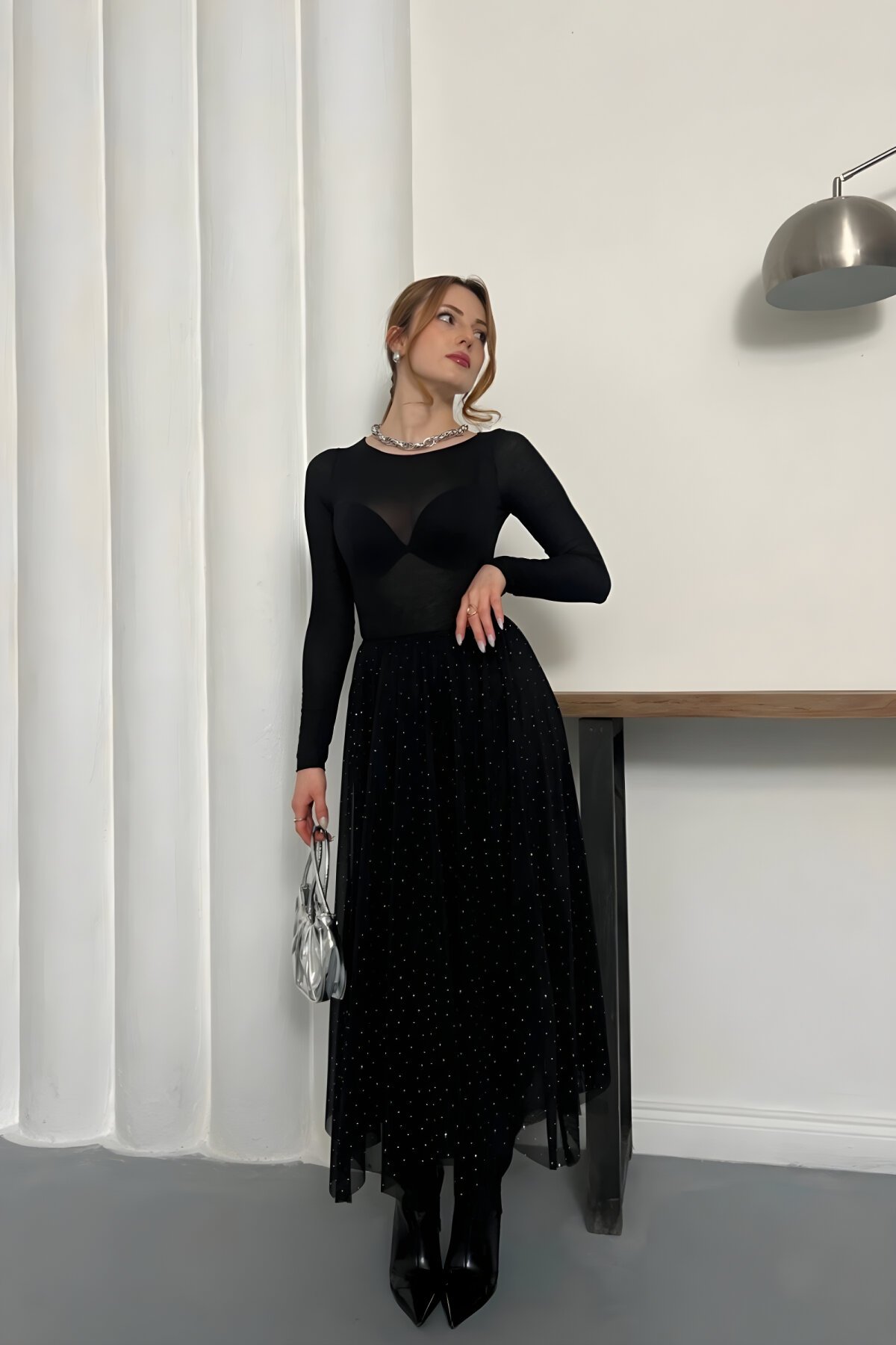 MOZENASiyah Asimetrik Taş Detaylı Astarlı Bel Lastikli Şifon Etek