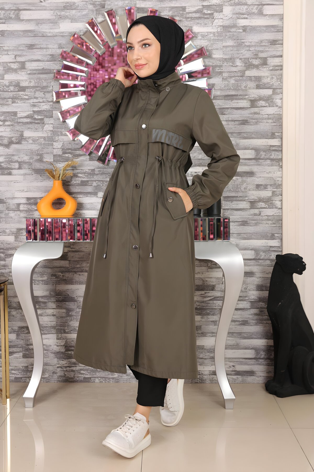 ModamihramYazı Detaylı Kapüşonlu Haki Mont