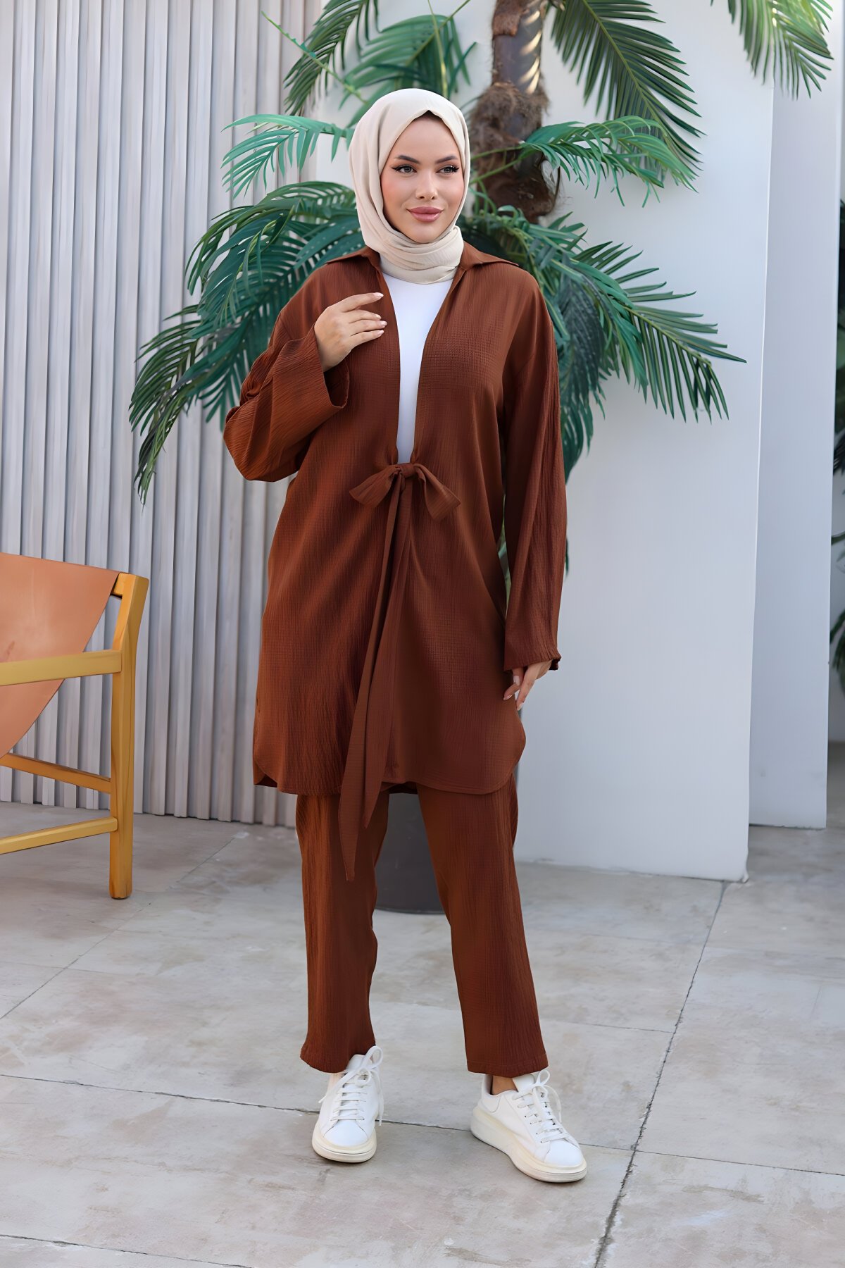 Misskayle markasına ait kahverengi ikili kimono takım ile şıklığı ve konforu bir arada deneyimleyin. Bağlama detayları sayesinde zarif bir duruş sergileyen bu tesettür takım, hem günlük kullanım hem de özel günler için idealdir. Modest giyimin adresi Devr-i Tesettür'ün seçili Misskayle ürünlerini hemen inceleyin.