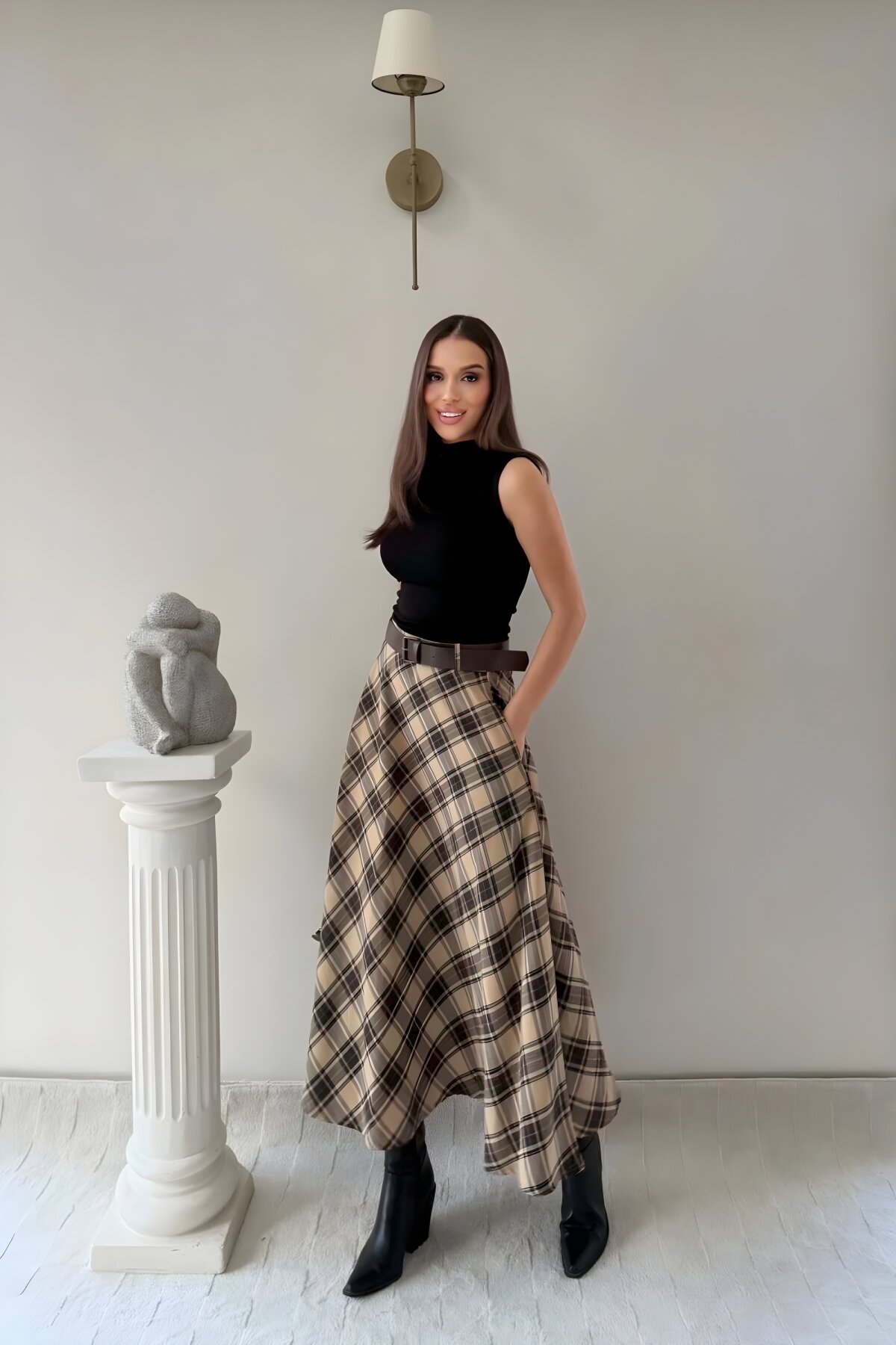 MOZENAKemer Detaylı Bej Ekose Desen Etek
