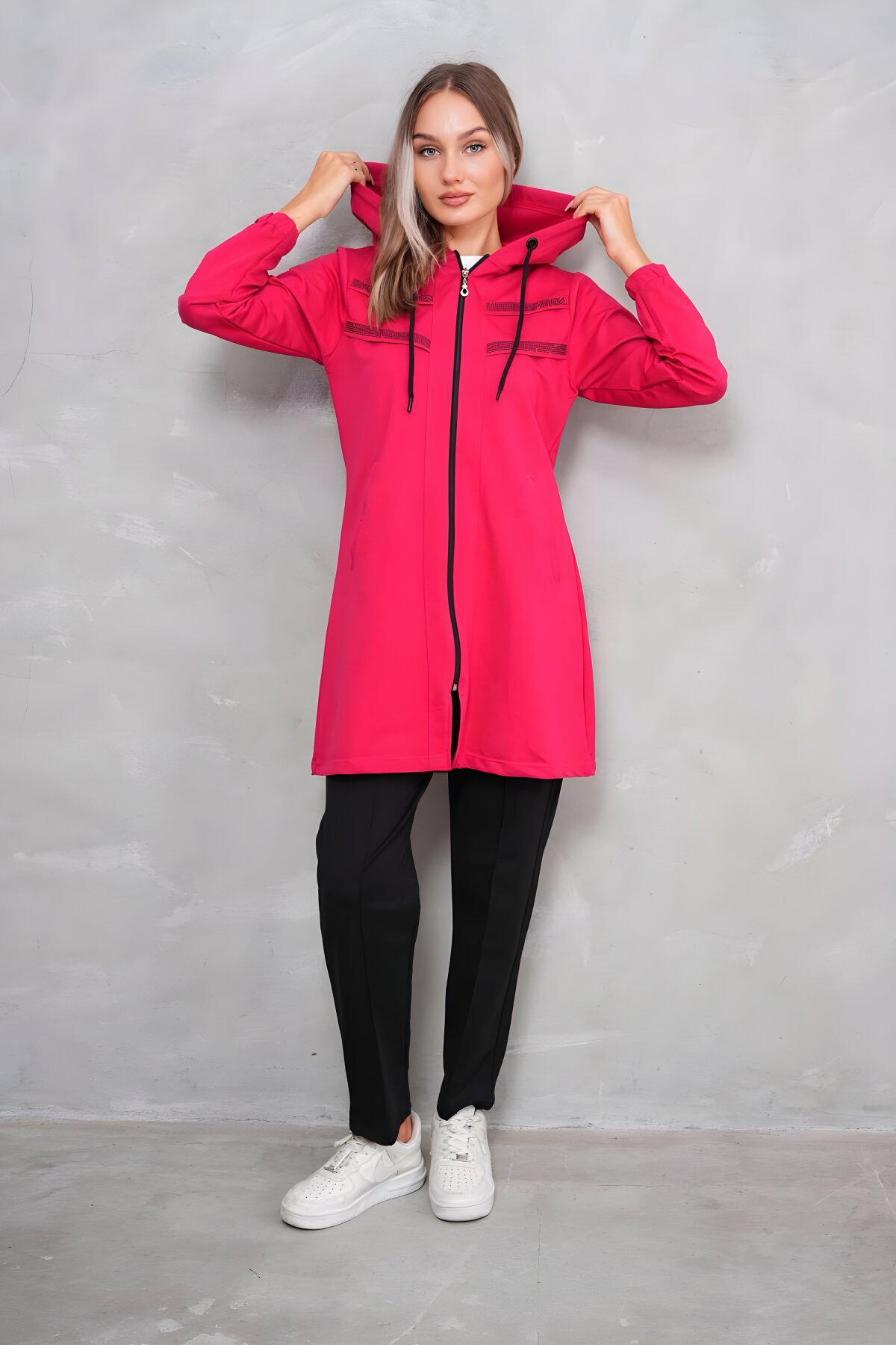 İkiplik kumaştan imal edilmiştir.%60 Pamuk - %35 Elestan - %5 LikraÜst Eşofman Boyu : 90 CM Üst Tunik FERMUAR kapamlı ve kapüşonludur.Pantolon Belden lastiklidir.Günlük hayatta, yürüyüş, tatil ve gezilerde ve ev ortamında giyilmeye uygun rahat şık bir modelimizdir.Manken 1,72 Boyunda Olup S Beden giymektedir.50-55 Kg - 36 - S Beden55- 60 Kg - 38 - M Beden60-65 Kg - 40- L Beden65-70 Kg - 42 -XL Beden70-78 Kg - 44- 2XL Beden tercih edebilirsiniz.Bu ölçüler boy/ağırlık uyumuna bağlı olarak değişkenlik gösterebilir. Sipariş öncesi beden önerisi için danışabilirsiniz.İade & İptal