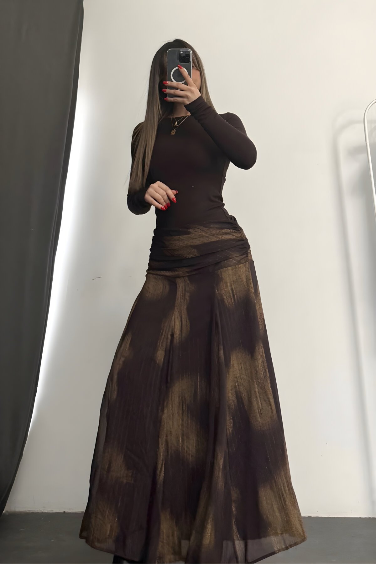 MOZENAKahverengi Desenli Bel Drapeli Şifon Etek