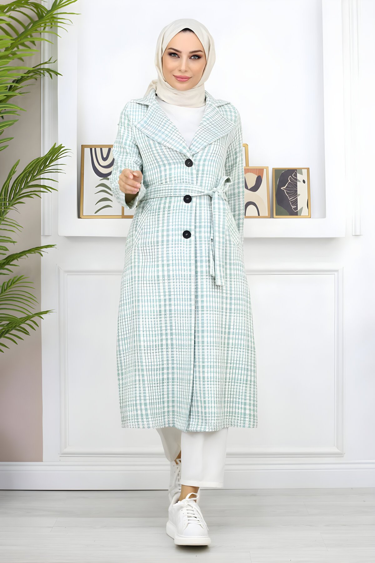 Kış gardırobunuzun vazgeçilmezi olacak Modamihram markalı bu ekoseli mint şanel kaşe kaban, hem sıcak tutar hem de şıklığınızı tamamlar. Kaliteli kaşe kumaşı ve özgün deseniyle tesettür giyimde fark yaratan bu özel ürünü Devr-i Tesettür güvencesiyle hemen keşfedin, tarzınızı yansıtın.