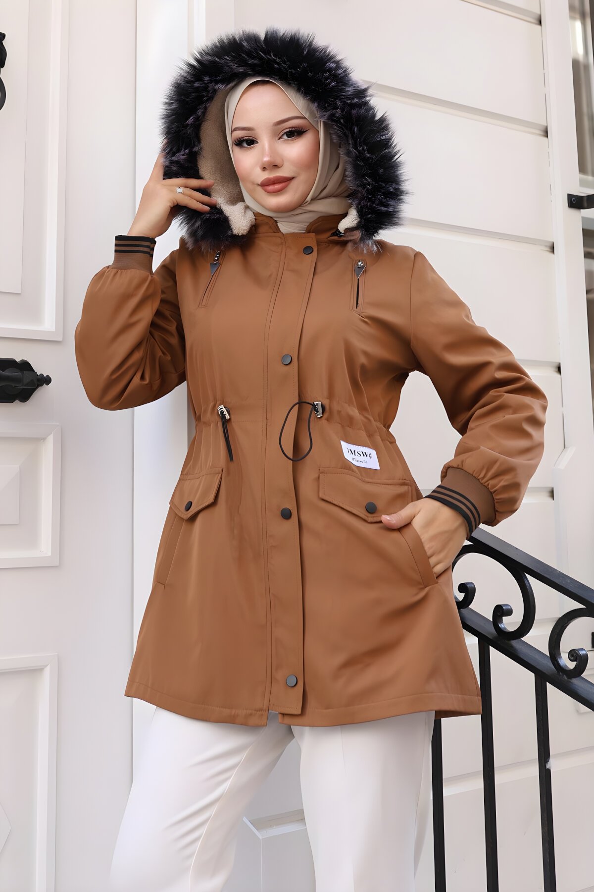 ModamihramKapüşonlu Fermuarlı Taba Mont