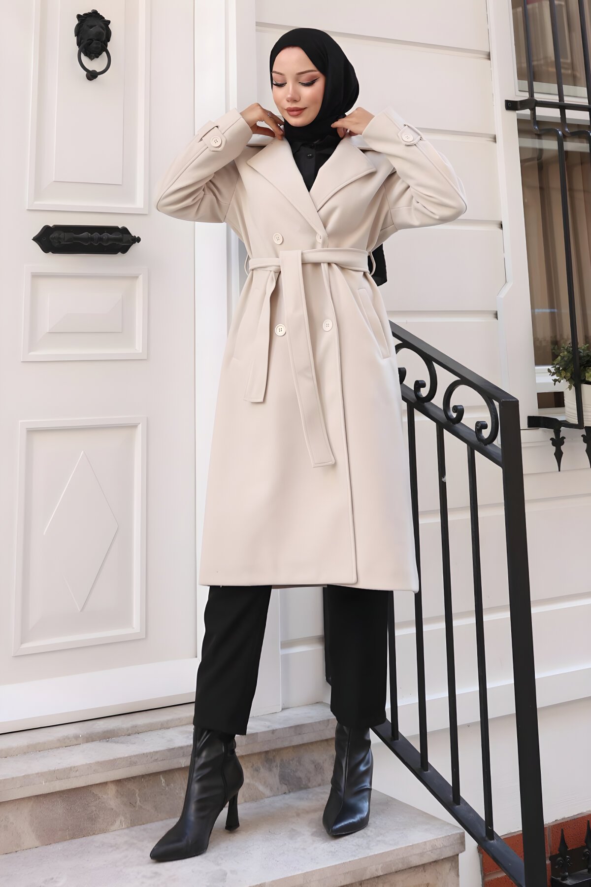Kış koleksiyonunun gözde parçası olan bu bej kuşaklı kaşe kaban ile soğuk havalara hazırlanın. Modamihram markasının kalite ve stilini yansıtan bu özel tasarım, beli vurgulayan kuşak detayı ve sıcak tutan kaşe kumaşıyla öne çıkıyor. Devr-i Tesettür platformunda güvenle sunulan bu uzun kaban, günlük ve şık tesettür kombinlerinizi tamamlamak için ideal bir seçimdir.