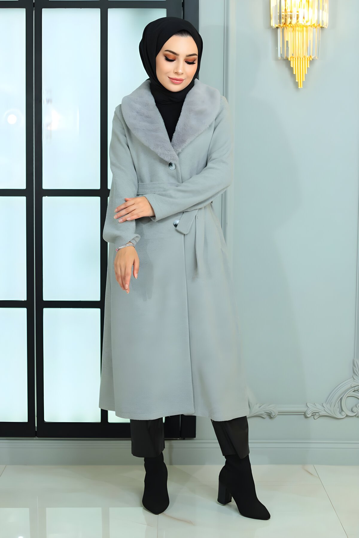 ModamihramGeniş Kürk Yakalı Gri Kaşe Kaban