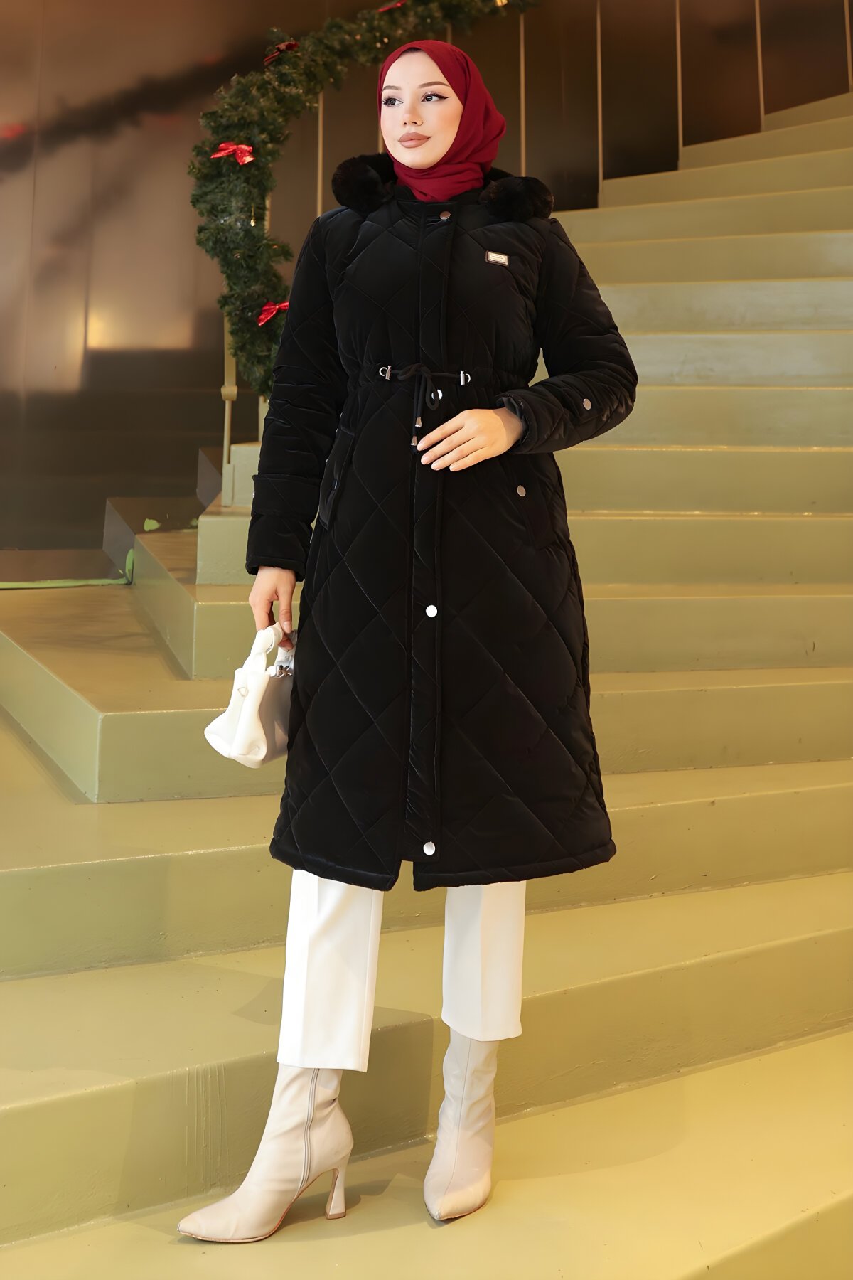 ModamihramBeli Bağcıklı Fermuarlı Siyah Kapitone Mont