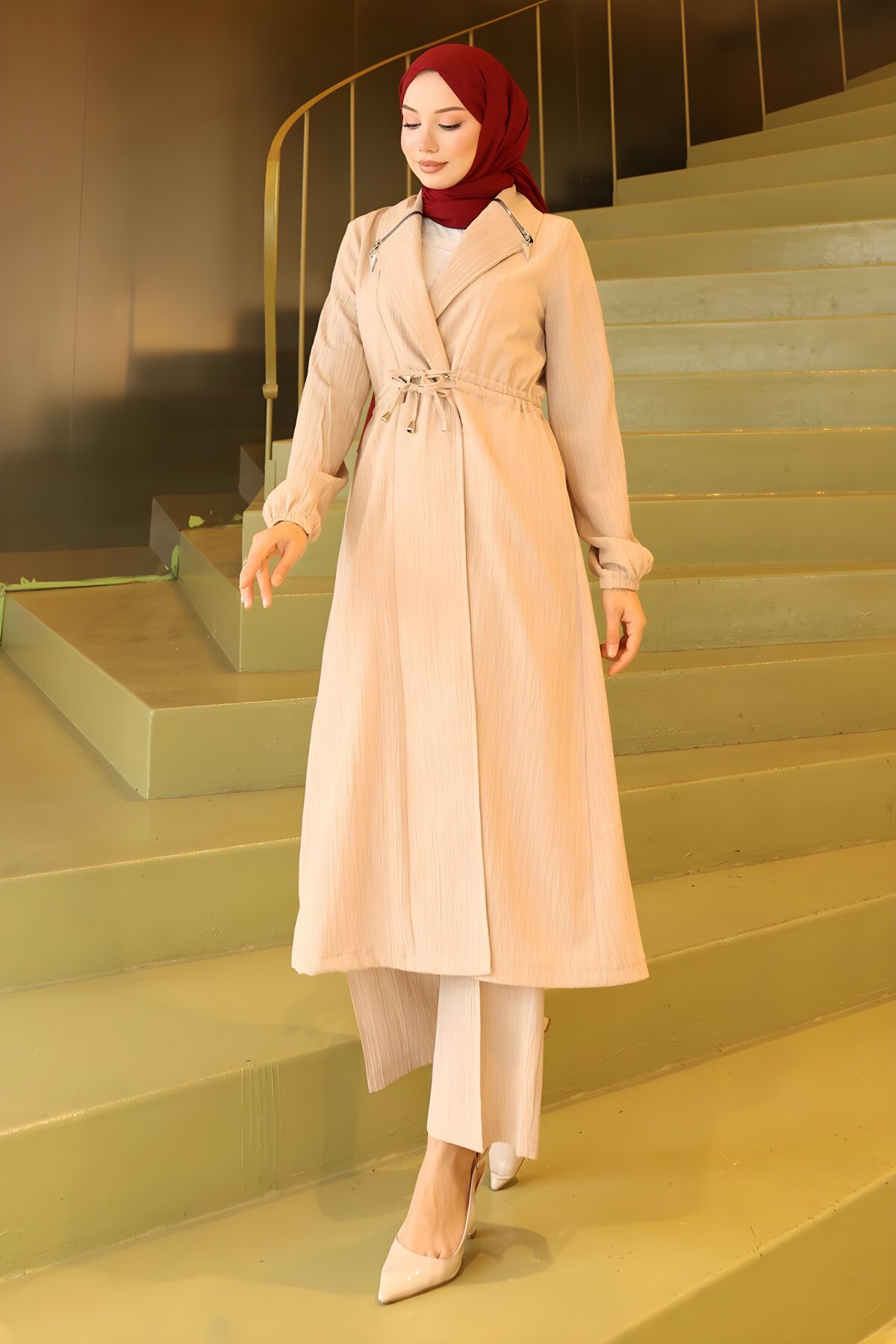 ModamihramYakası Fermuar Detaylı Bej İkili Tesettür Takım