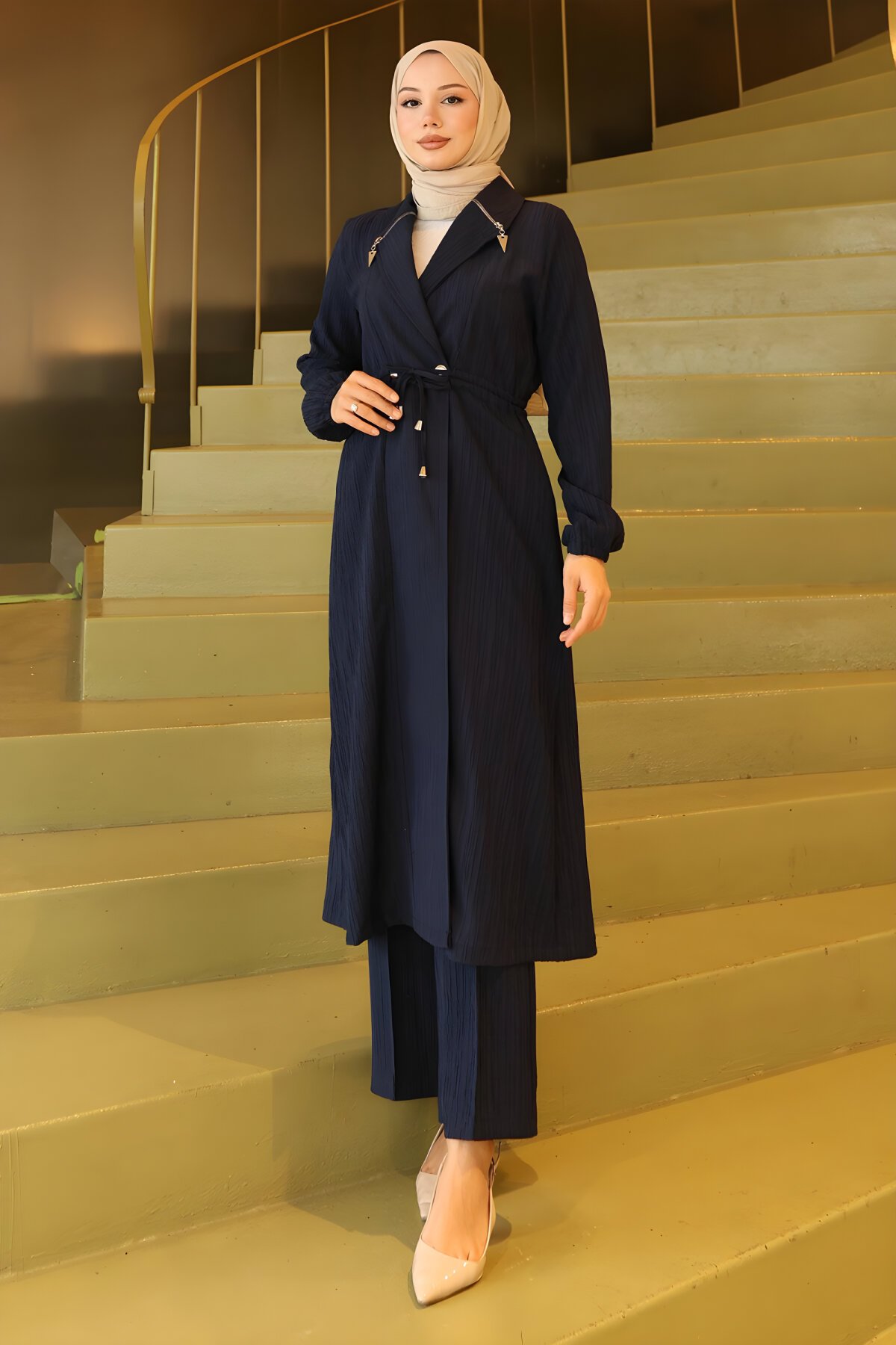 Lacivert rengi, yakası fermuar detaylı şık ikili tesettür takımı keşfedin. Günlük kullanıma uygun bu modern Modamihram takımı, hem rahatlık hem de zarafet sunar. Devr-i Tesettür güvencesiyle en uygun fiyatlarla gardırobunuza ekleyin. Yeni sezon tesettür takım modelleri.