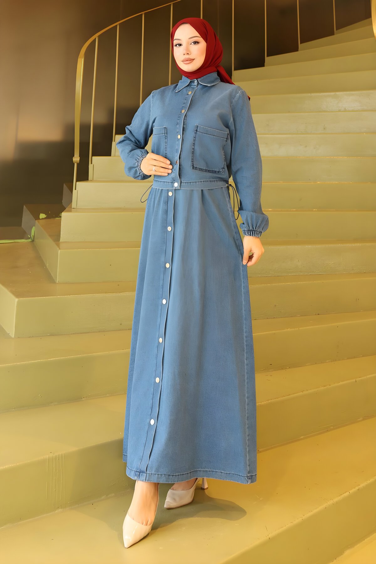 Modamihram markasına ait bu açık mavi kot ikili takım, tesettür giyimde şıklığı ve rahatlığı birleştiriyor. Boydan düğmeli ceketi ve uyumlu alt parçasıyla günlük ve özel anlarda kullanabileceğiniz harika bir kombin. En beğenilen tesettür takım modellerini Devr-i Tesettür güvencesiyle keşfedin.
