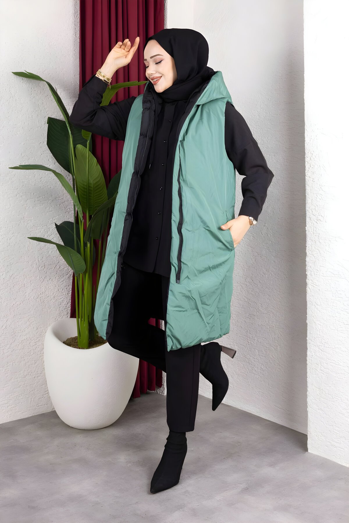 MisskayleYeşil Renk Çift Taraflı Kapüşonlu Şişme Yelek