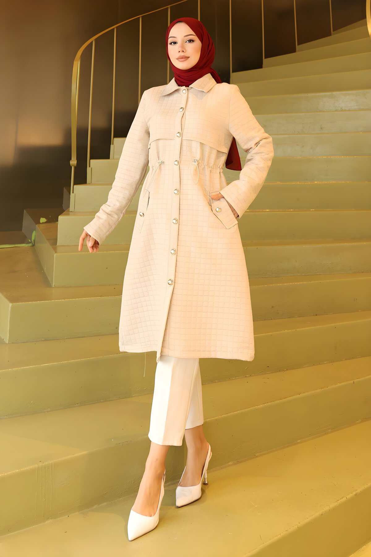 Modamihram markasına ait bu bej kapitone kap modeli, soğuk havalar için ideal bir tercihtir. Beli bağcıklı detayı sayesinde istediğiniz formu verebilirsiniz. Düğmeli ön kapaması ile şıklığı ve tesettürü bir arada sunan bu Kap & Pardesü ürününü sadece Devr-i Tesettür güvencesiyle keşfedin.