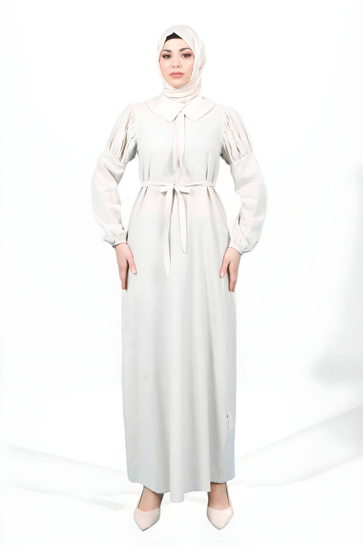 فستان محجبات بيج من قماش الكتان، غير مبطن، فستان بحزام غير مبطن وبأكمام مكشكشة.
