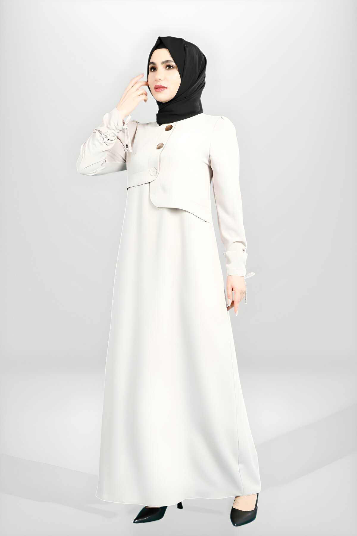 • فستان محتشم أسود بأكمام مزمومة وتفاصيل أزرار