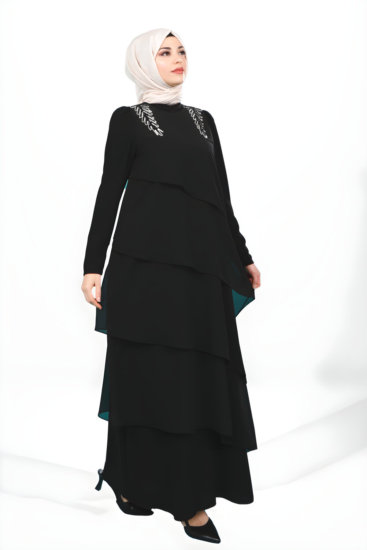اكتشفي الأناقة والرقي مع فستان السهرة المحتشم باللون الأسود من Beyza، الذي يتميز بتصميم فريد يجمع بين الكشكشة الأنثوية والتفاصيل الحجرية اللامعة على الكتف. هذا الفستان مثالي للمناسبات الخاصة، متوفر الآن على منصة Devr-i Tesettür، وجهتك الأولى لأزياء السهرة المحتشمة الفاخرة التي تلبي ذوقك الراقي وتضمن لك إطلالة جذابة ومحتشمة في آن واحد.