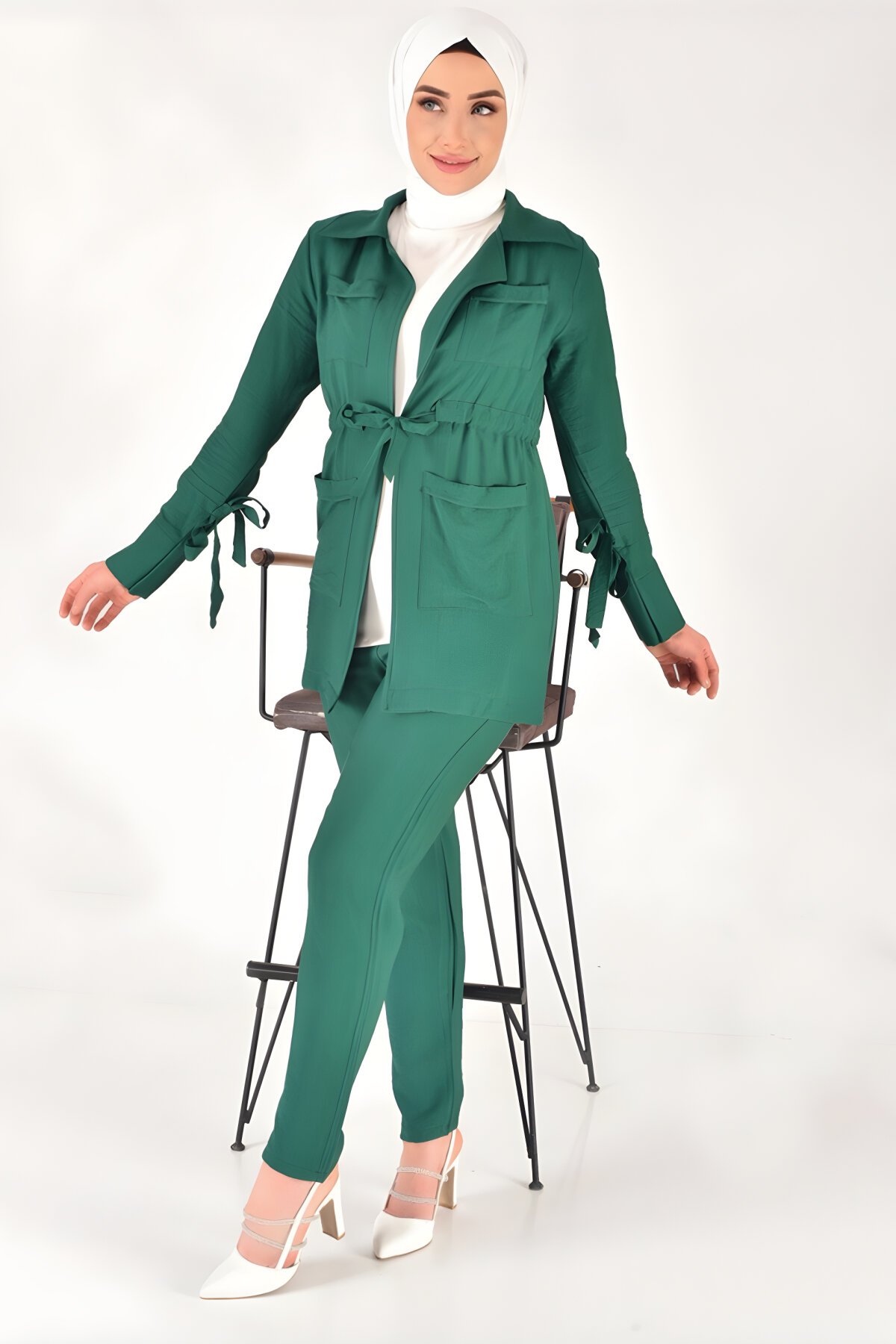 اكتشفي الأناقة الفريدة للطقم المحتشم من ثلاث قطع باللون الأخضر المتوفر لدى Devr-i Tesettür. يتميز هذا الطقم المصمم من Bycoolest Butik بقماش لينا بمظهر الكتان الفاخر، ويشتمل على تفاصيل زمزمة أنيقة عند الخصر. مثالي لإطلالاتك اليومية والمناسبات الخاصة، حيث يجمع بين الراحة والتصميم العصري الملتزم بالاحتشام والأناقة.
