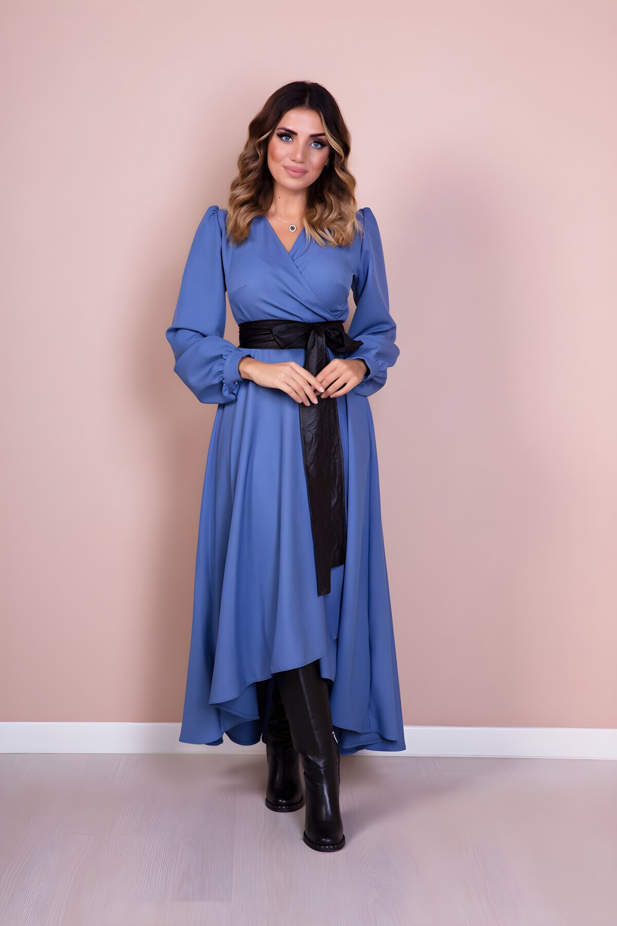 Bidoluelbise فستان محتشم طويل الأكمام بقصة غير متناظرة مع حزام جلد باللونين ال أزرق والأسود