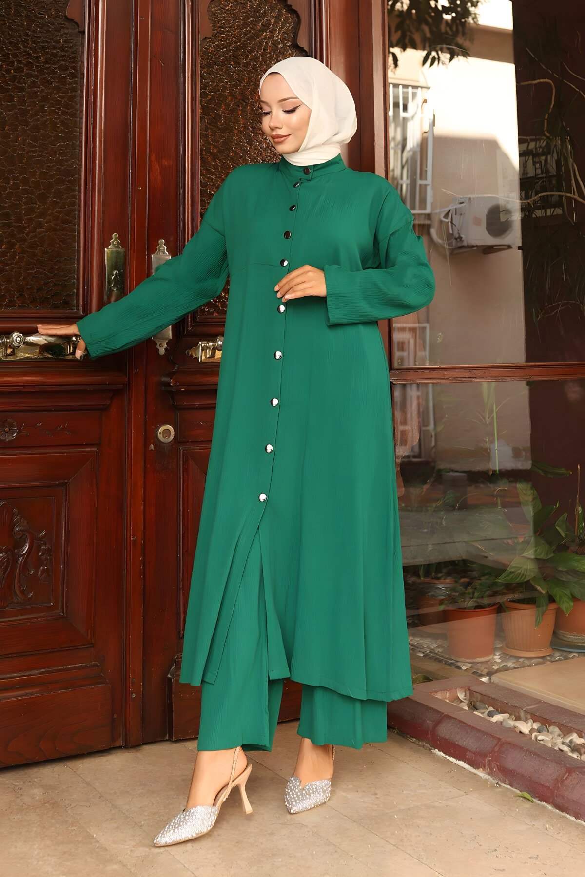 Misskayle طقم محتشم طويل باللون الأخضر مع تفاصيل ياقة مزدوجة