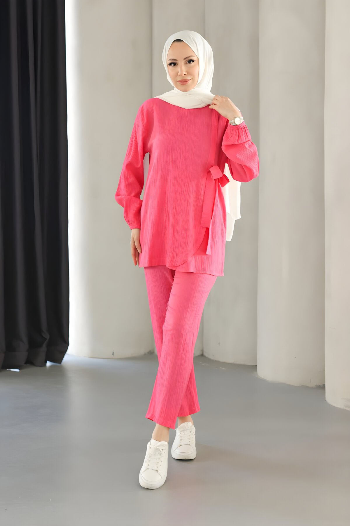 اكتشفي أناقة اللون الفوشيا مع طقم Misskayle المحتشم المكون من قطعتين. يتميز هذا الطقم بتفاصيل ربط عصرية ويعد خياراً مثالياً لإطلالة نهارية أو مسائية راقية. تسوقي أفضل تصاميم الأطقم المحتشمة من مجموعة Devr-i Tesettür الحصرية واستمتعي بالجودة والراحة في آن واحد.