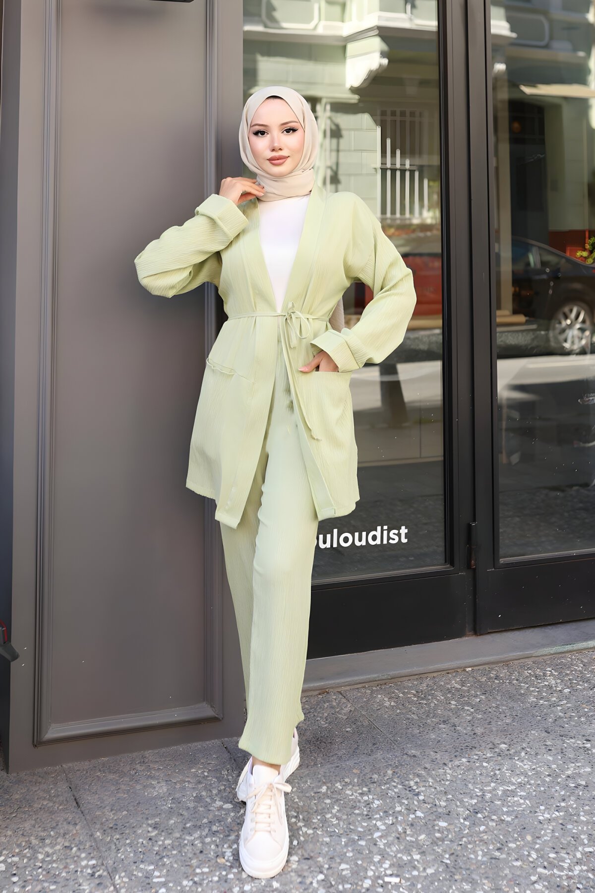 اكتشفي الأناقة العصرية مع طقم كيمونو محتشم من Misskayle. هذا الطقم المميز باللون الأخضر النعناعي وقصة الكيمونو المريحة مثالي لإطلالة صباحية أو مسائية. يتميز الطقم بتفاصيل الجيبين المزدوجة التي تضيف لمسة عملية. تسوقي الآن أحدث تشكيلات أطقم Misskayle ا لحصرية على Devr-i Tesettür.