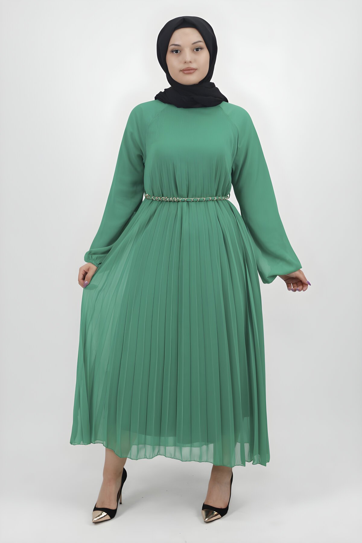 İkollفستان شيفون محتشم طويل باللون الأخضر، مزين بكسرات أنيقة وحزام سلسلة