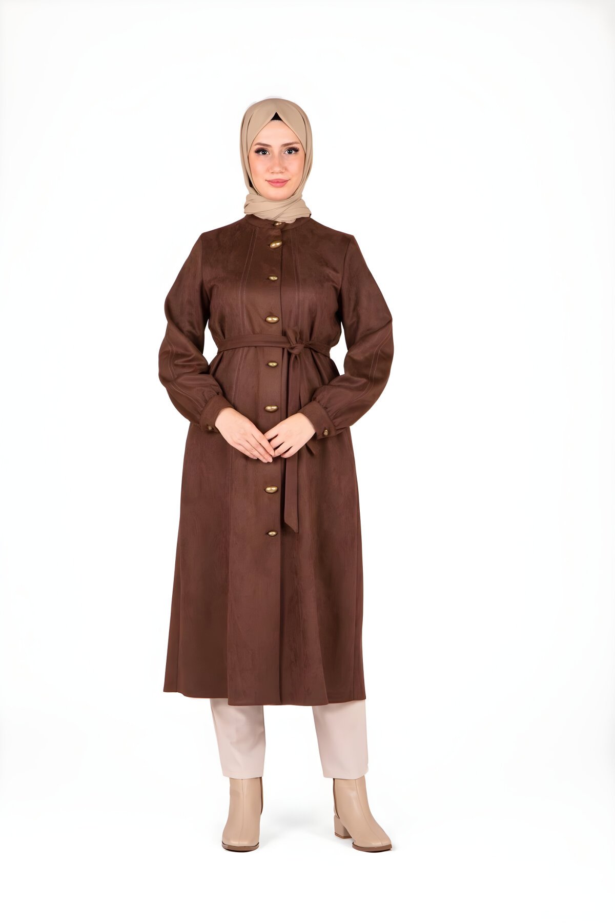 اكتشفي الأناقة الشتوية مع معطف Beyza المحتشم الطويل. هذا المعطف المميز مصنوع من قماش الشمواه الفاخر باللون البني الدافئ، ومصمم بتفاصيل أزرار عملية من الأمام. مثالي لإطلالاتك اليومية والمناسبات. تسوقي الآن أحدث موديلات المعاطف الطويلة والجواكيت النسائية العصرية من تشكيلة Devr-i Tesettür الواسعة والحصرية لملابس المحجبات.