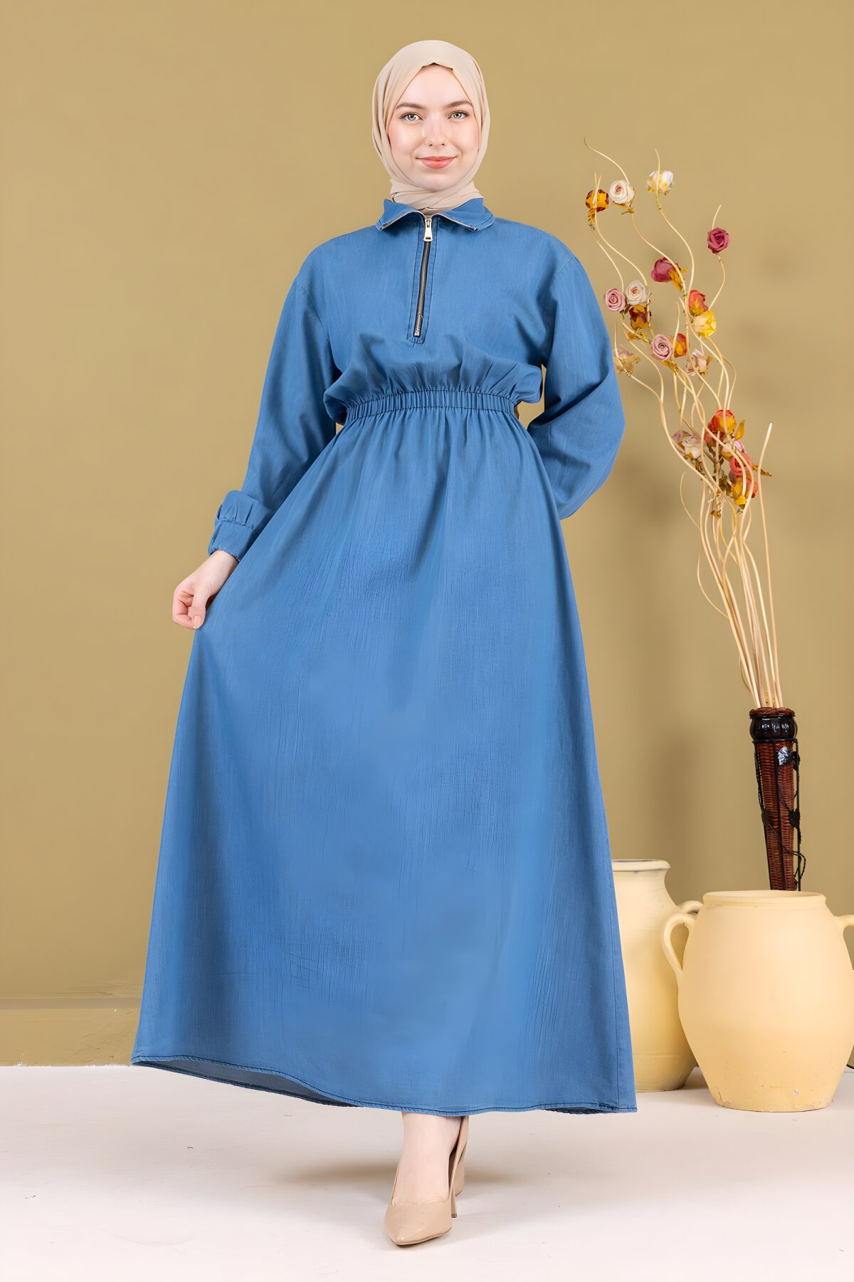 Modamihram فستان محتشم من قماش الجينز الأزرق الفاتح، مزود بسحاب وخصر مطاطي