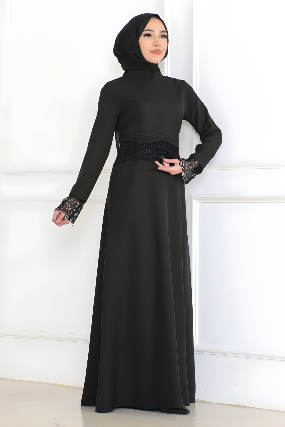 Modamihramفستان محتشم باللون الأسود مزين بتفاصيل من الدانتيل