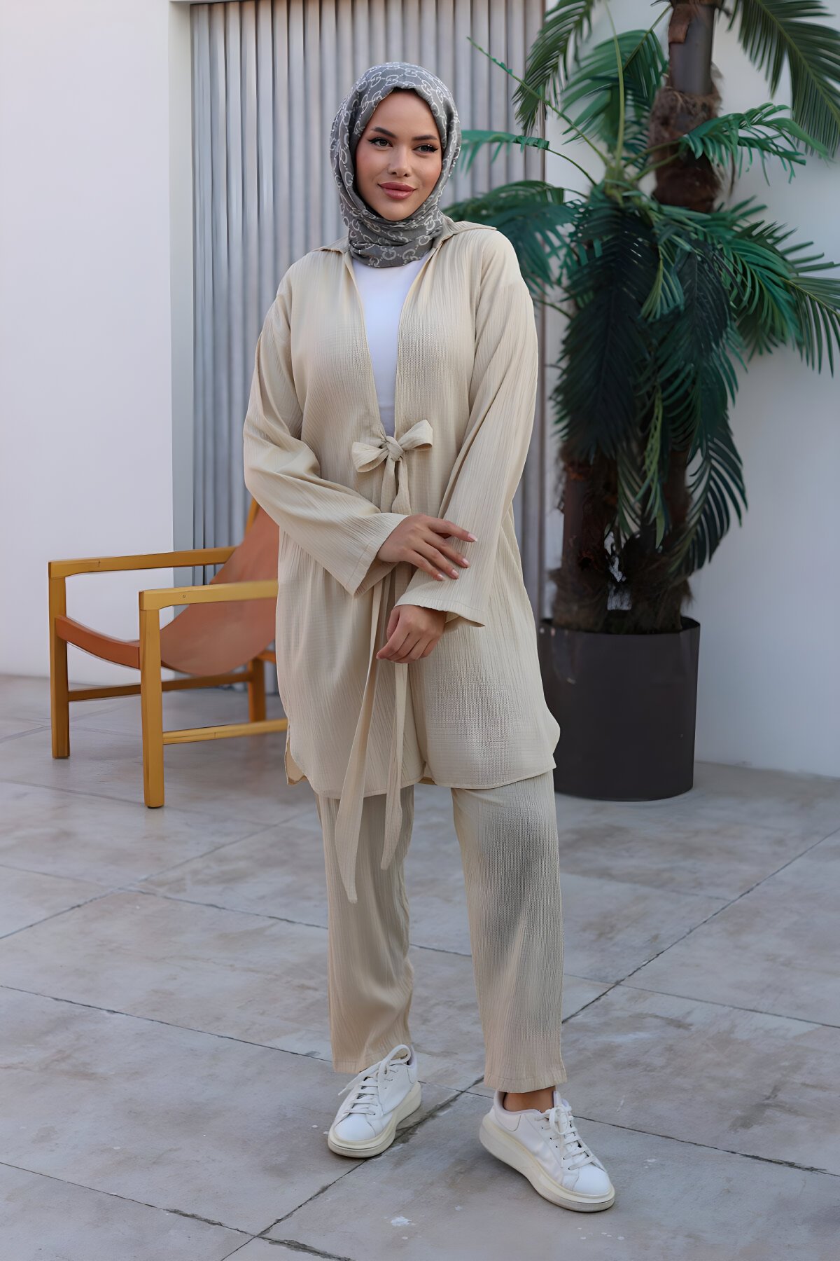 اكتشفي أناقة الطقم المحتشم الثنائي بتصميم الكيمونو الذي تقدمه Misskayle. هذا الطقم مثالي للإطلالات اليومية والمناسبات، ويأتي باللون البيج الهادئ مع تفاصيل ربط أنيقة على الخصر. تسوقي أحدث مجموعات Misskayle الحصرية على منصة Devr-i Tesettür الرائدة في عالم الأزياء المحتشمة بتغطية كاملة وراحة فائقة.
