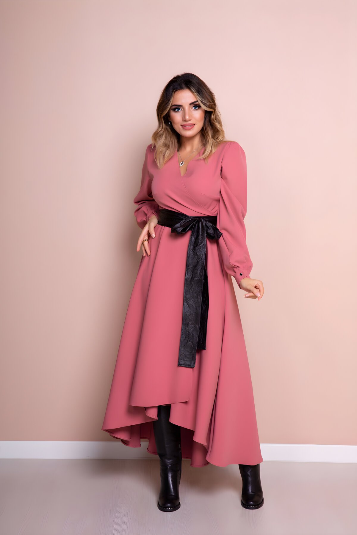 Bidoluelbiseفستان محتشم بأكمام طويلة وقصة غير متماثلة بلون الورد المجفف والأسود، مزود بحزام جلدي