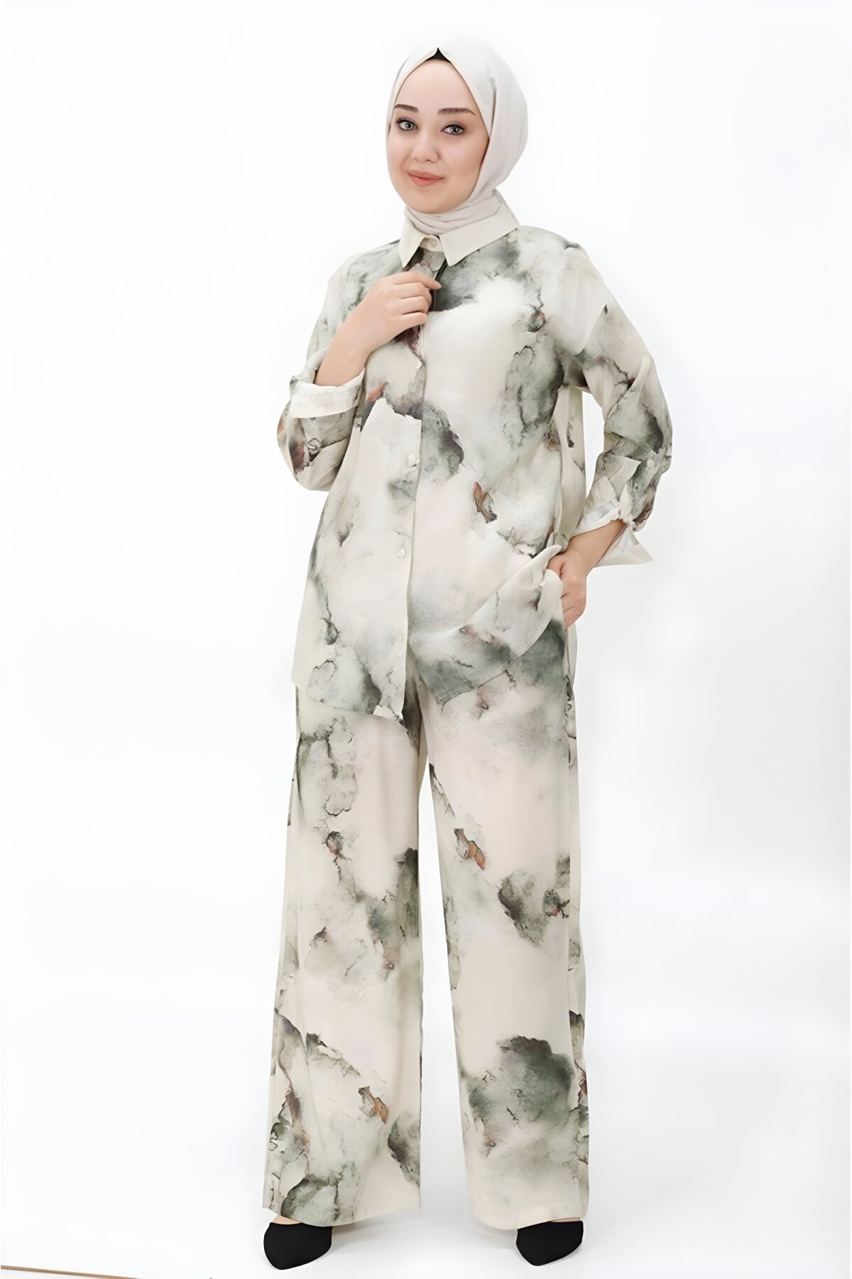 طقم محتشم ثنائي منقوش باللون الكاكي