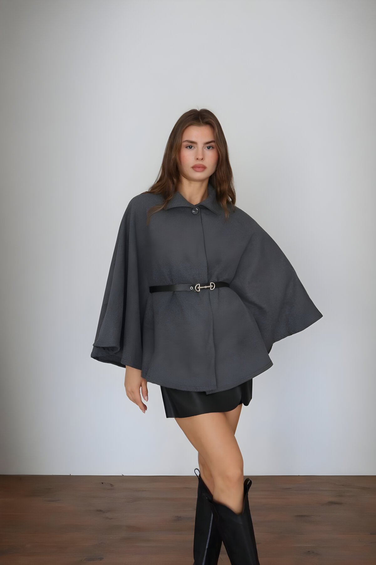بونشو كاب محتشم من قماش الكاشيه بلون أنثراسيت ومزود بحزام