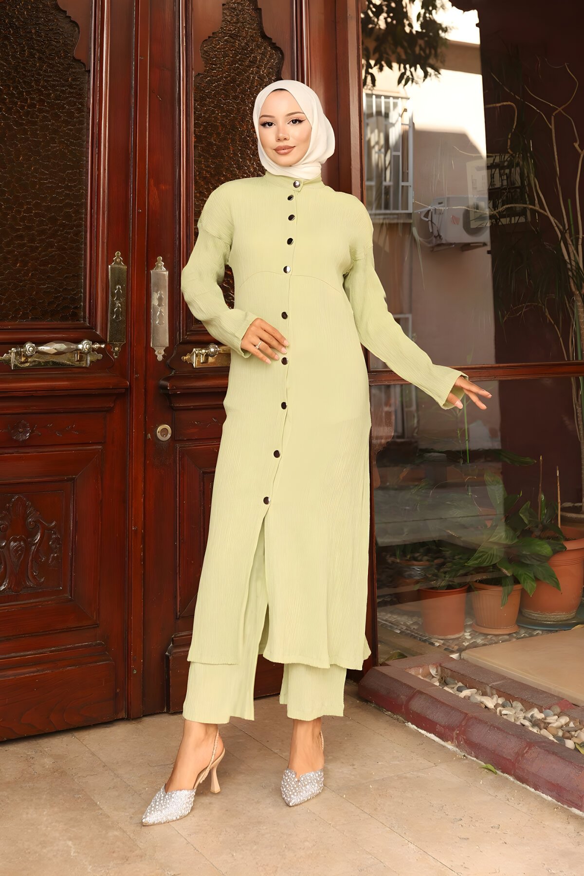 طقم طويل إكلي باللون الأخضر النعناعي مزين بتفاصيل ياقة