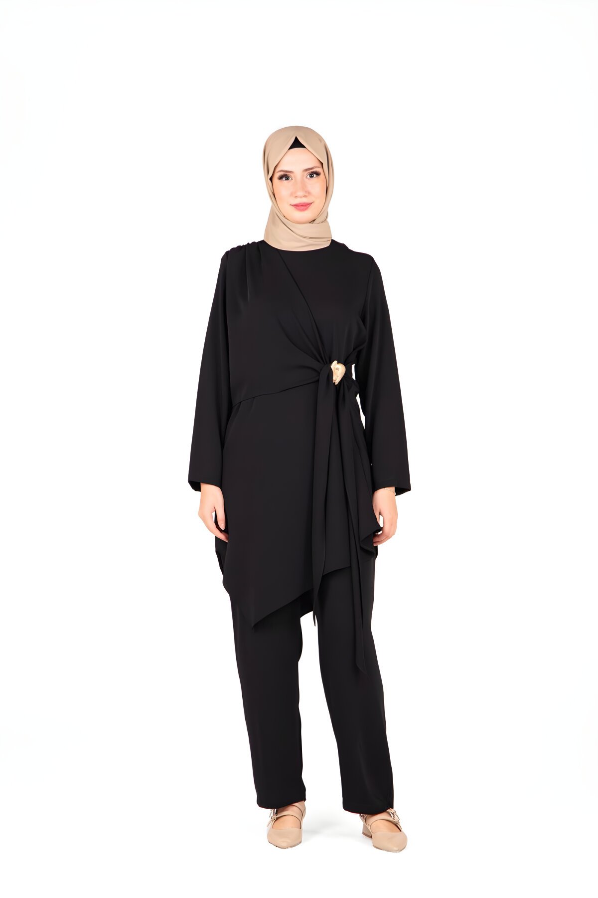 Beyzaطقم محتشم مكون من قطعتين (تونك وبنطال) باللون الأسود ومزين بإكسسوار للخصر