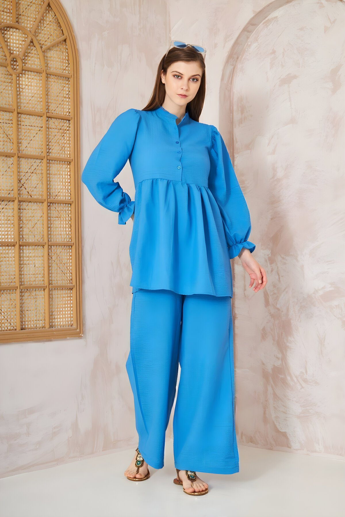• طقم تونيك وبنطال محتشم أزرق بنسيج غوفريه وأكمام بالون