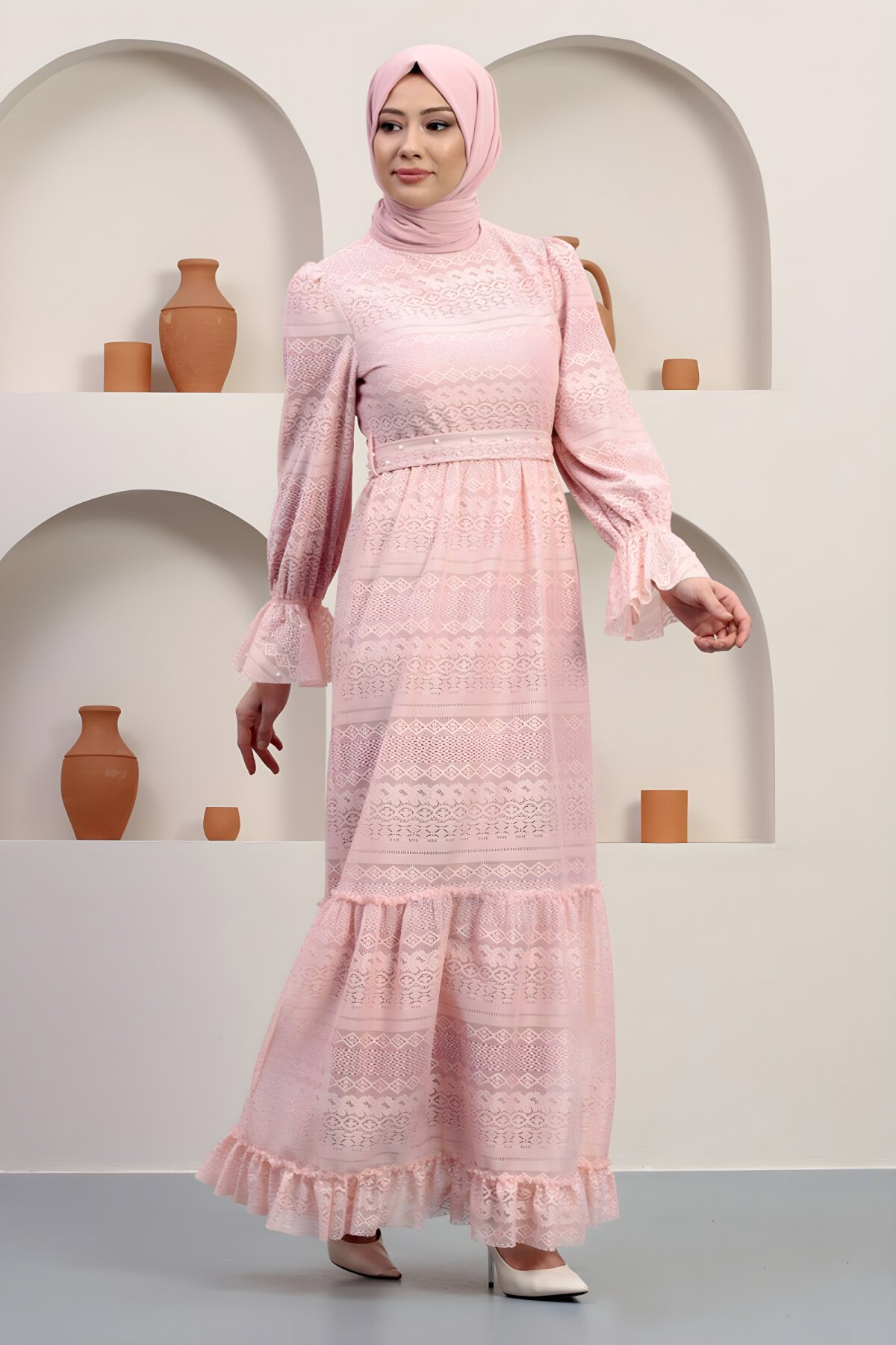 اكتشفي أناقة فساتين السهرة المحتشمة من Modamihram على منصة Devr-i Tesettür. هذا الفستان الأنيق يأتيكِ باللون البودرة الهادئ، مزين بتفاصيل الدانتيل الفاخر واللؤلؤ لإطلالة مثالية ومبهرة في جميع مناسباتك الخاصة.