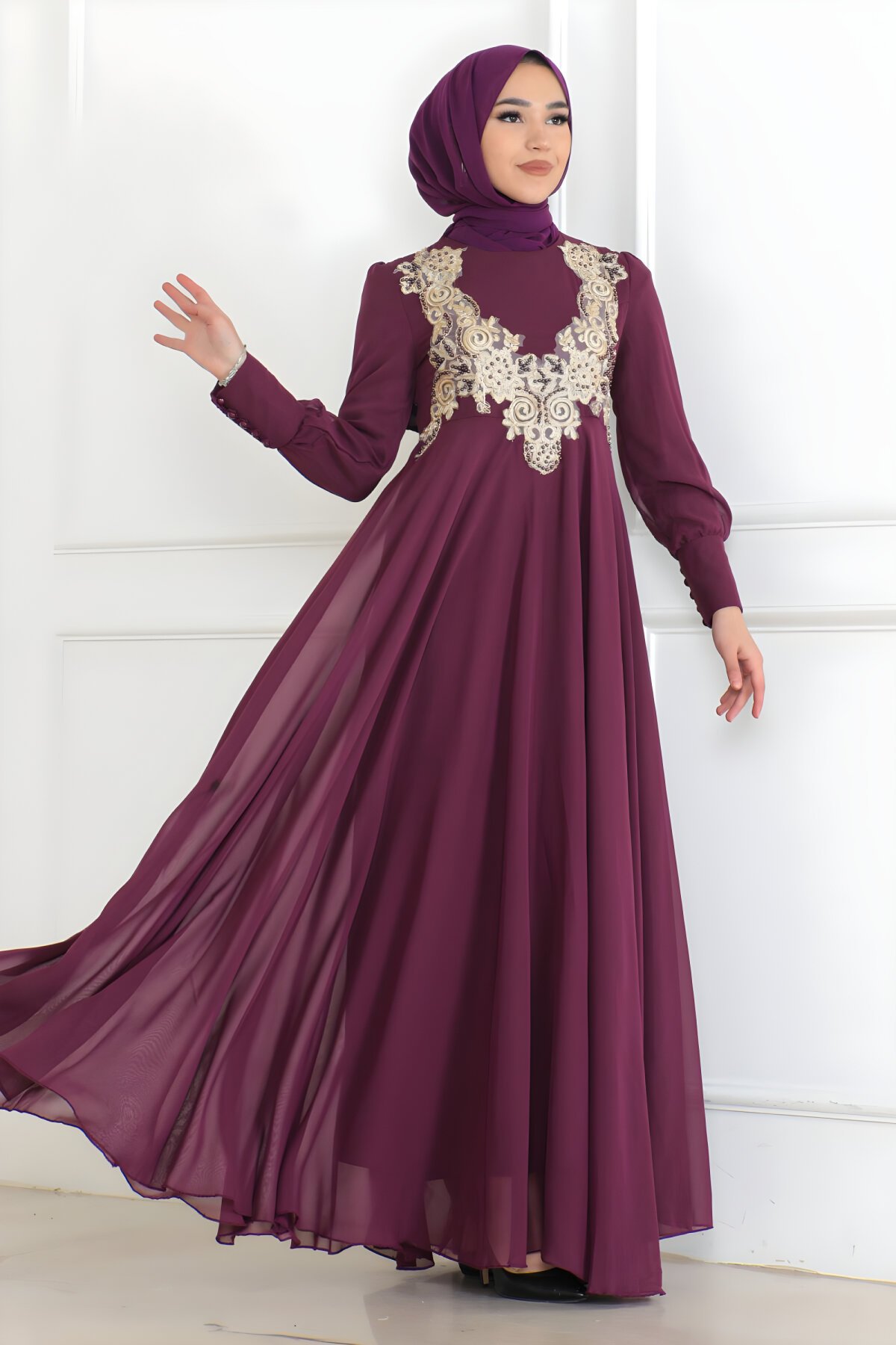 اكتشفي الأناقة والرقي مع تشكيلة Modamihram الحصرية على Devr-i Tesettür. نقدم لكِ فستان سهرة محتشم مصمم من قماش الشيفون الناعم، بلون أرجواني داكن فاخر. هذا الفستان مزين بتفاصيل دقيقة من الدانتيل، مما يجعله الخيار الأمثل للمناسبات المسائية والحفلات. تسوقي أحدث فساتين السهرة المحتشمة الآن وتمتعي بإطلالة لا مثيل لها.