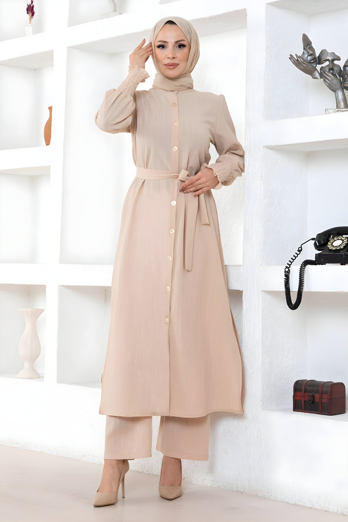مواصفات المنتج: منتج من أزياء المحجبات للموسم الجديد. غير مبطن. يُنصح بشراء مقاس واحد أكبر من مقاسك المعتاد. القالب ضيق. التونيك يحتوي على أزرار أمامية يمكن استخدامها. الحزام منفصل. يتميز بتفاصيل فتحة جانبية. البنطلون ذو خصر مطاطي. قد يكون هناك اختلاف في درجة لون المنتج بسبب لقطات التصوير.