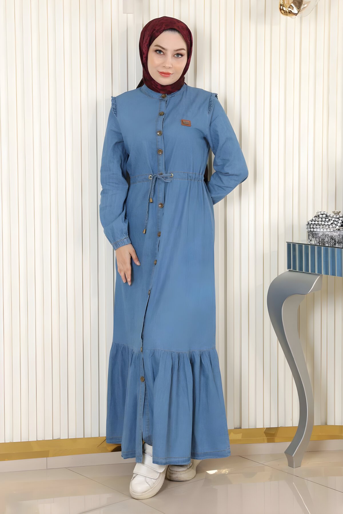 Modamihram فستان محتشم جينز باللون الأزرق الفاتح مع تفاصيل أزرار ورباط للخصر