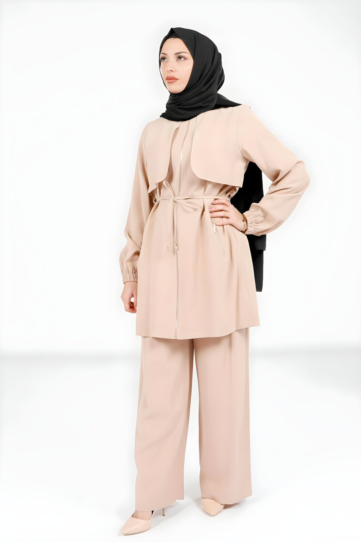 اكتشفي أناقة مجموعة Beyza الجديدة. طقم محتشم أسود ثنائي مكون من جاكيت وبنطلون، مثالي للإطلالات الرسمية والعصرية. تسوقي أحدث الأزياء النسائية المحتشمة ذات الجودة العالية حصرياً لدى Devr-i Tesettür. يتميز بقصته المريحة ولونه الأسود الكلاسيكي الذي لا يبهت أبداً.