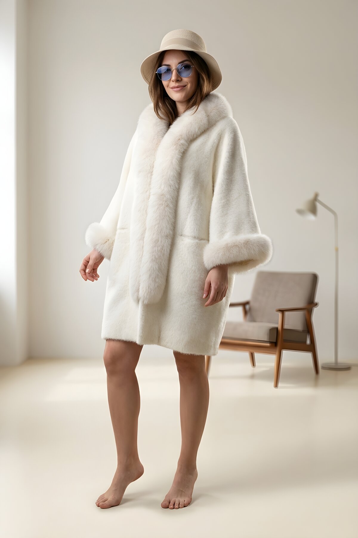 Bohem Stil معطف شتوي محتشم إيكرو من أنجورا الإيطالية، يتميز بغطاء رأس مبطن بالفرو وجيوب