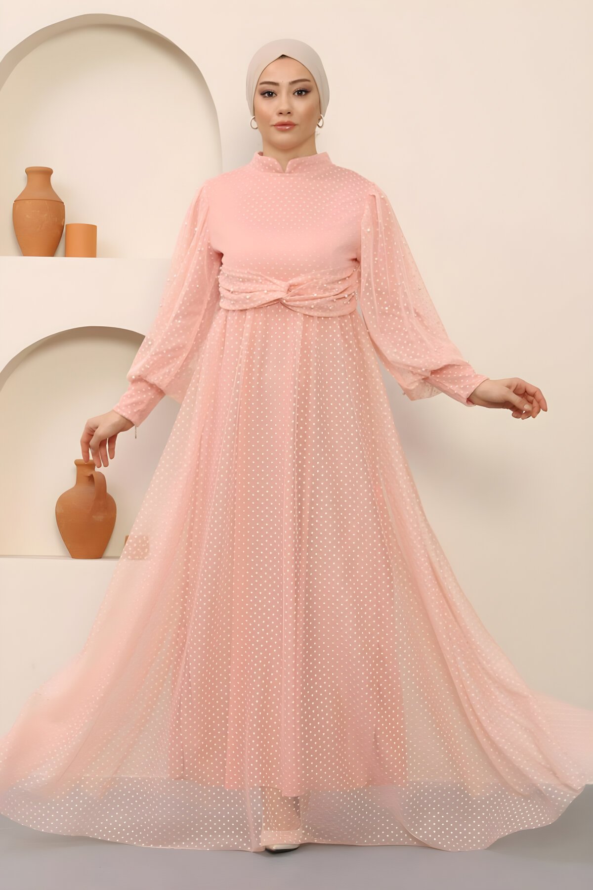 Modamihramفستان سهرة محتشم من التول بلون البودرة مزين بتفاصيل لؤلؤ