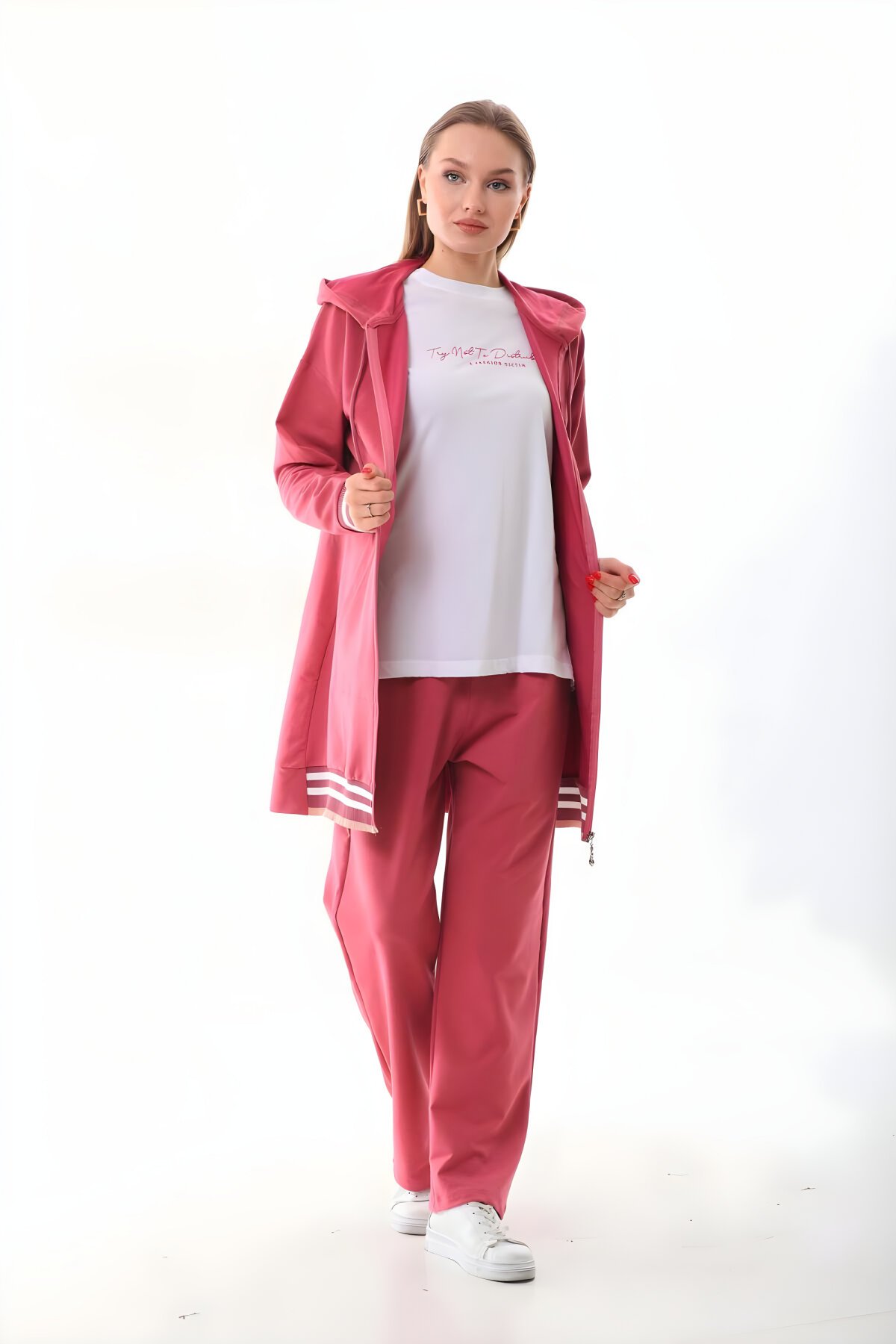 مصنوع من قماش خيطين عالي الجودة، والتيشيرت من قماش سوبريم.السترة بسحاب كامل، مزودة بغطاء للرأس وجيب كنغر أمامي.تم تزيين الحافة السفلية وأساور الأكمام بشريط ريبانا.طول السترة: 85 سم التيشيرت الداخلي بياقة مستديرة وأكمام طويلة، ومزين بكتابة بارزة من نفس اللون في القسم الأمامي.طول التيشيرت: 70 سم البنطال بأرجل واسعة ومزود بجيوب جانبية.يتكون الطقم الرياضي من 3 قطع.مصمم ليتناسب مع تفضيلاتكم في الملابس الرياضية اليومية والملابس الرياضية للمحجبات.طول العارضة: 173 سم والمنتج الذي ترتديه العارضة بمقاس M. 50-55 كجم - مقاس S 55-60 كجم - مقاس M 60-67 كجم - مقاس L 67-75 كجم - مقاس XL 75-85 كجم - مقاس 2XL هي القياسات المثالية. تم تحديد هذه القياسات بناءً على التوافق بين الطول والوزن، ويرجى طلب اقتراح لاختيار المقاس خارج هذه المعايير.الإرجاع والإلغاء