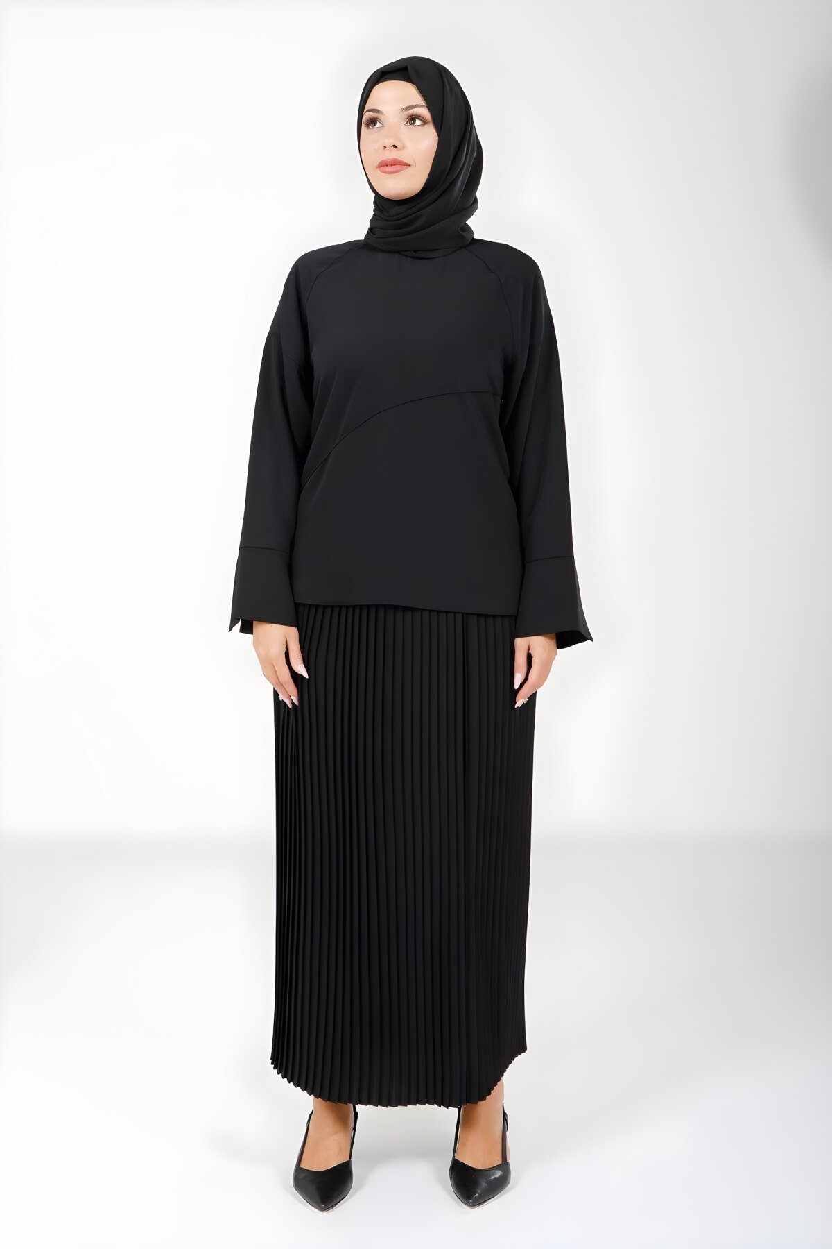 BeyzaTwo-Piece Modest Set featuring a Pleated Skirt and Blouse in Black
