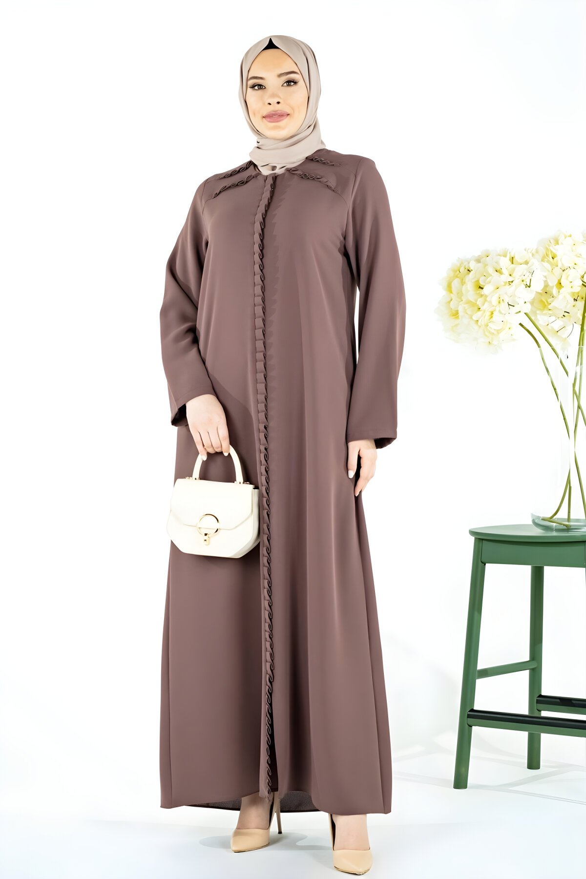 Discover the sophisticated Beyza Brown Abaya at Devr-i Tesettür. This modest outer garment features a unique Arhavi collar and delicate pleat detailing on the front. Perfect for elegant, specific modest wear, this Abaya ensures comfort and style while maintaining the brand's descriptive and calm voice. Shop the latest Ferace collection now.