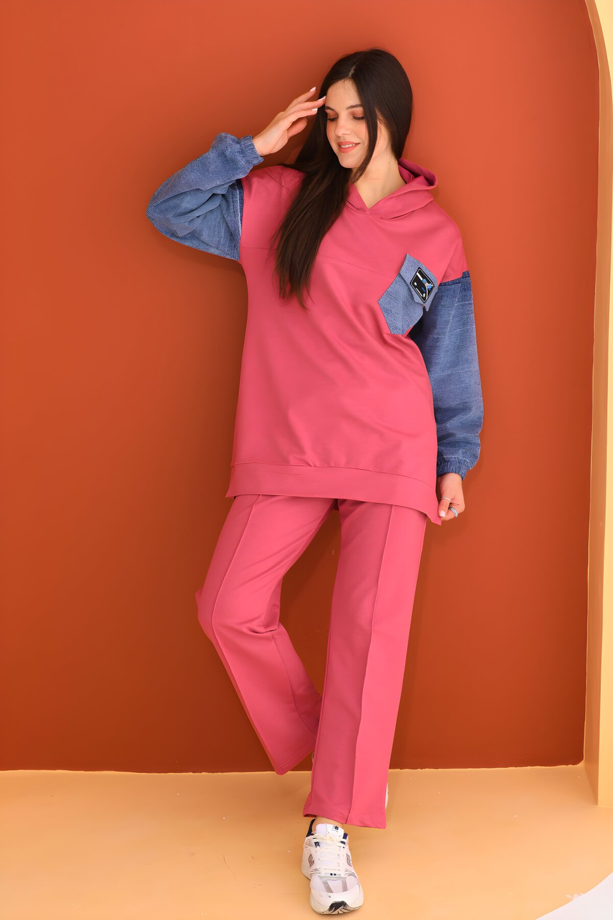Produced from 1st-class two-thread fabric. It contains Lycra. It provides comfortable wear and is a non-sweating, breathable fabric. Upper Sweatshirt: Detailed with denim fabric on the sleeves and pocket. Hooded and the bottom part has short slits. Upper length 75 cm. Tracksuit Bottoms: Straight wide leg. Full-length topstitched. Tracksuit bottoms have double side pockets and an elasticated waist. It is a sporty-chic and comfortable set suitable for daily wear. It is of ideal thickness for summer and spring months. Slight color tone differences may be seen due to studio shoots. The model height is 1.73 and the product on her is size S. 50-55 Kg: Size S, 55-60 Kg: Size M, 60-65 Kg: Size L, 65-70 Kg: Size XL, 70-78 Kg: Suitable for Size 2XL.