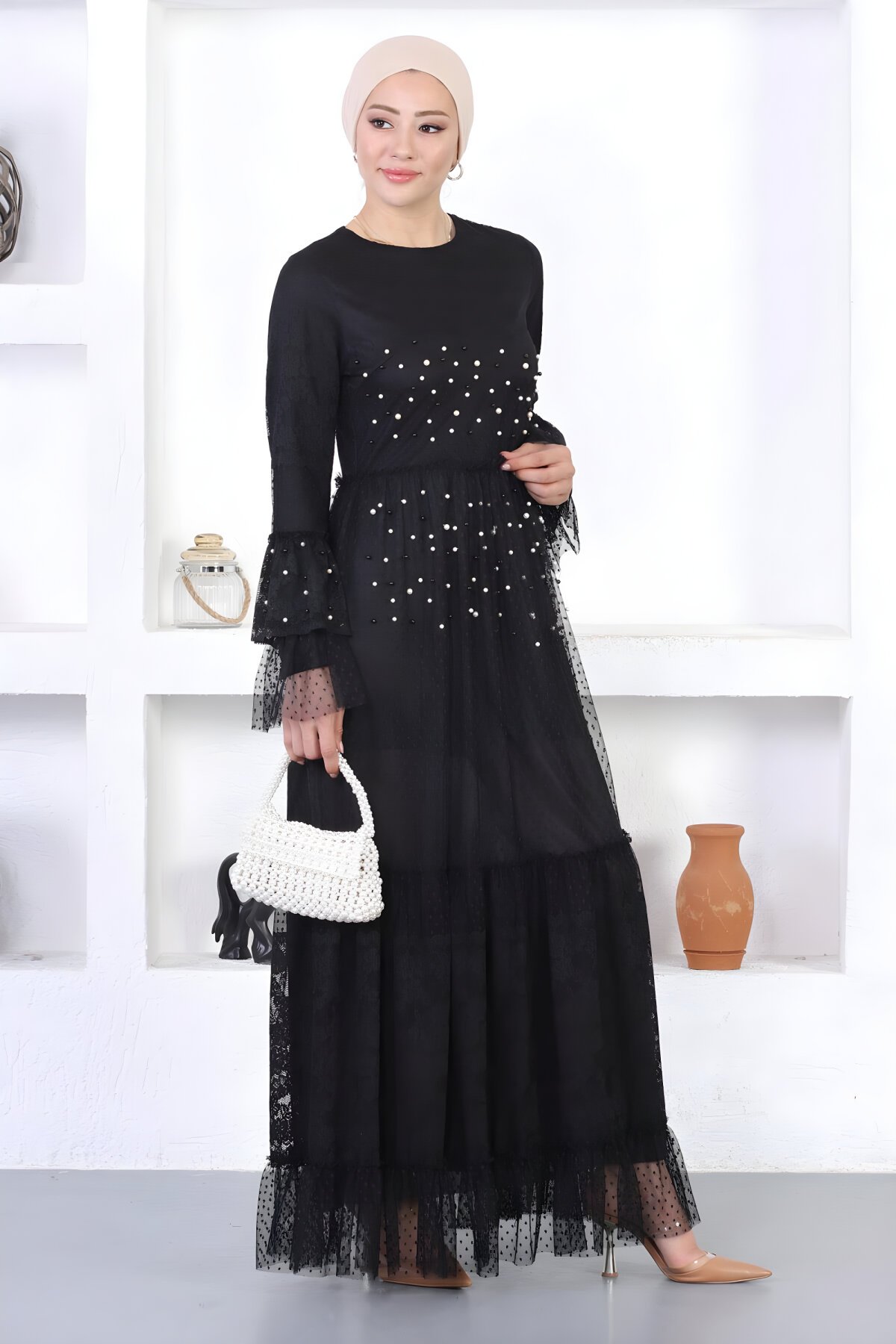 Product Property: It is a new season hijab fashion product. It is lined. It has a functional side half zipper and one functional button on the back. It features pearl details. There may be a tonal difference in the product color due to concept shots.